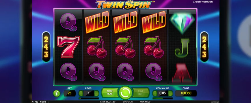 Kdo řekl, že online automaty nemohou nabídnou autentickou Las Vegas atmosféru? Twin Spin je tu, aby dokázal, že se mýlíte! Má k tomu účinné zbraně: například lesklé drahokamy, sedmičky, zvonečky, ovoce a symboly karet na válcích! Maximální možná výhra dosahuje 135 000 €/270 000 mincí. Je to jen další z důvodů, proč se ponořit do této velmi oblíbené hry.
