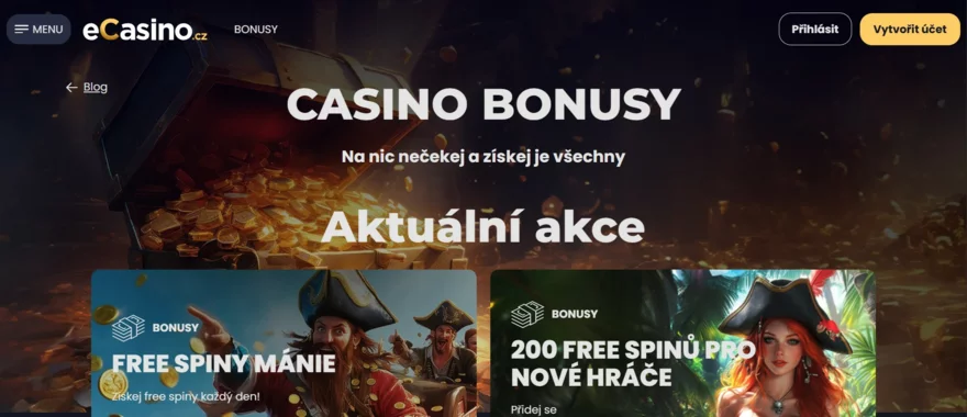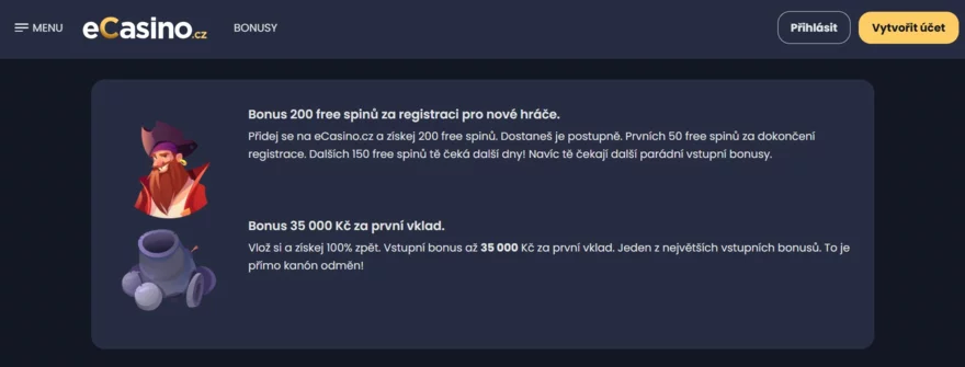 Pojďme si bonusovou nabídku zhodnotit blíže. Noví zákazníci ocení bonusy za registraci bez vkladu, díky nimž si mohou casino vyzkoušet bez rizika. Například eCasino Vám ihned po dokončení plné registrace připíše 200 Kč do hry zdarma, což je typický no deposit bonus pro nové hráče.