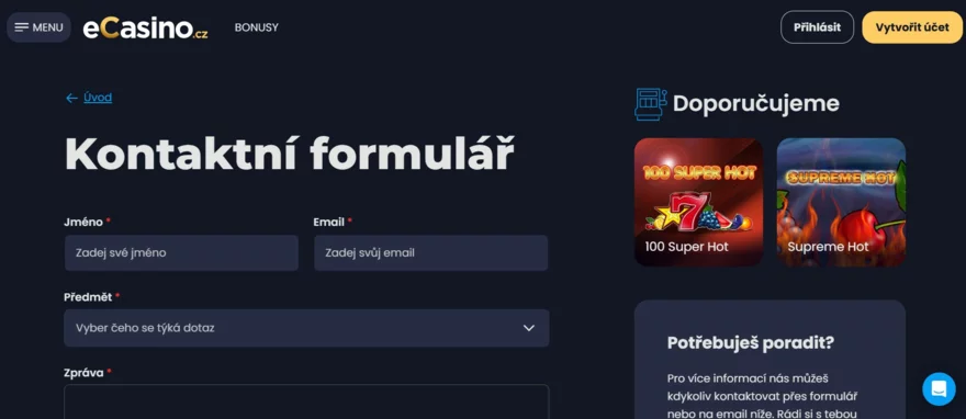 Zodpovědné hraní a péče o hráče jsou v eCasino samozřejmostí. Můžete si nastavit limity a využít kontaktní kanály, pokud potřebujete pomoc. A kdykoliv budete řešit aktivaci čtenářského bonusu nebo dotazy kolem free spinů, zákaznická podpora vám odpoví česky a ochotně. Bezpečnost plateb je zaručená licencí Ministerstva financí – hrajete tedy legálně a férově.
