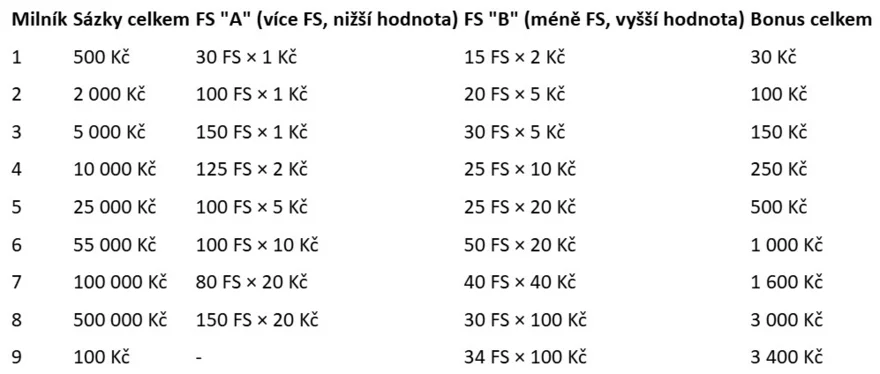 Princip je jednoduchý: hráči plní milníky podle výše svých sázek. Po dosažení každého z nich si z nabídky vyberou jeden z bonusových balíčků. Například za prosázených 500 Kč je možné zvolit buď 30 free spinů po 1 Kč, nebo 15 free spinů po 2 Kč.