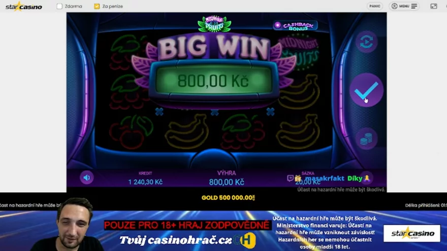 Vyzkoušeli jsme si hry od ruznýc výrobů her napřiklad pragmatic a to hry Fisch Eye, Gates of Olympus, tyhle hry jsou moc fajn a přihrály bonusové napínavé specialní funkce kde jsme vhrali několik stovek korun, hráčům jsem pověděl svůj názor na tyto hry a dal jim informace, které jistě nevěděli a budou se jim hodit. Další sloty jsem zkoušel od diváků a to byl slot Midnait Fruit a 5fruits, obě tyto hry mně překvapili a získal jsem několik krásných bigwinů které najdeš ve videu.Tady máš ale malou ochutnávku ze hry Midant Fruit a to rovných 800KČ.